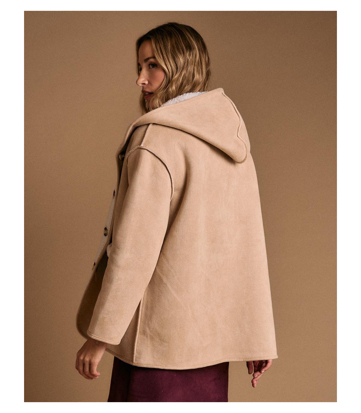 Abrigo en color crudo confeccionado en tejido tipo borrego, con capucha, cierre de botones tipo trenca y bolsillos delanteros.