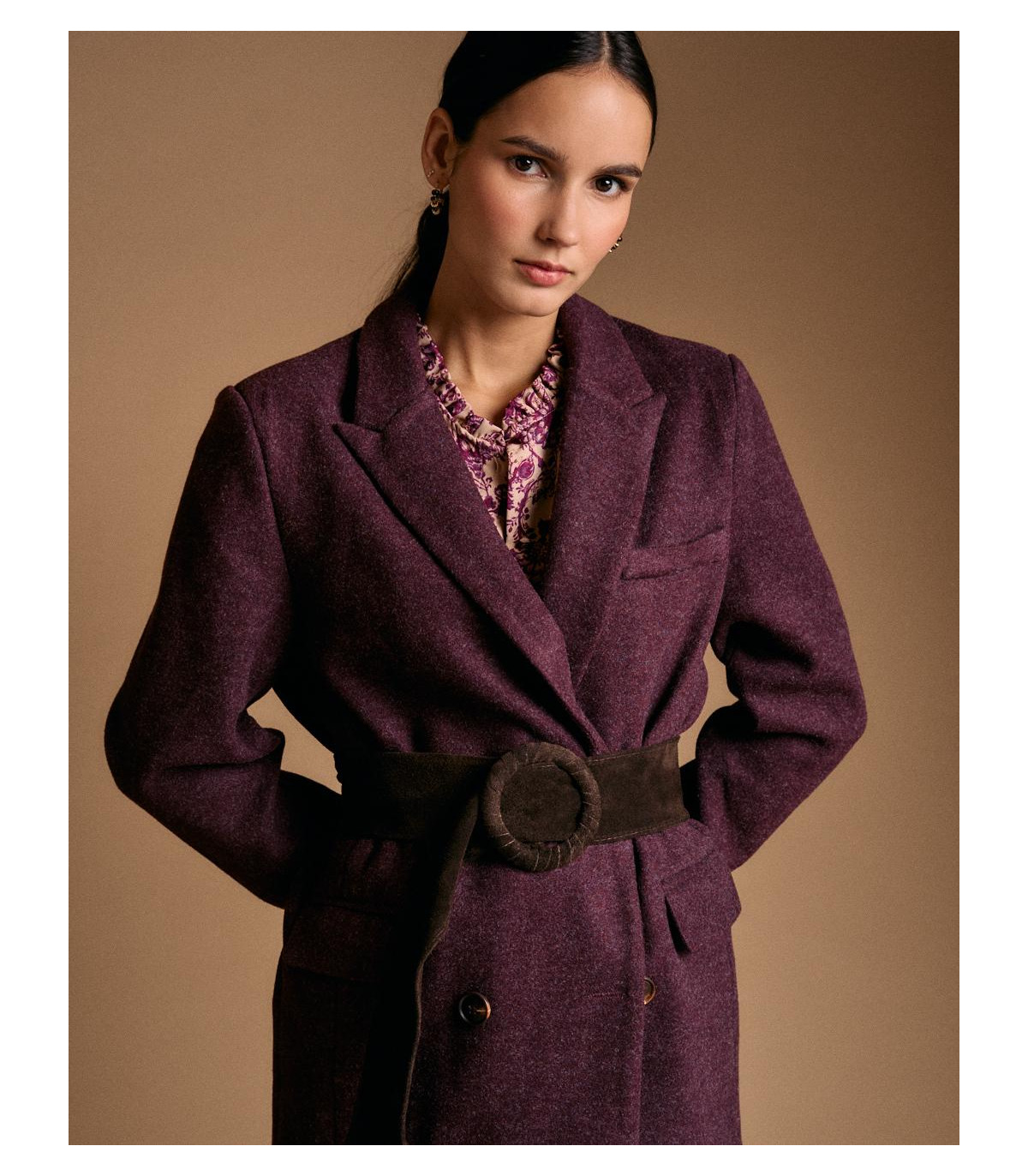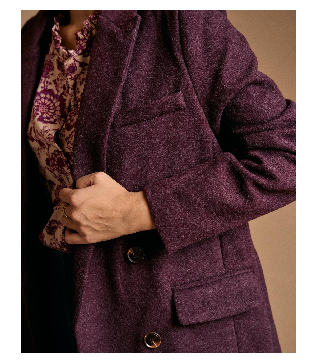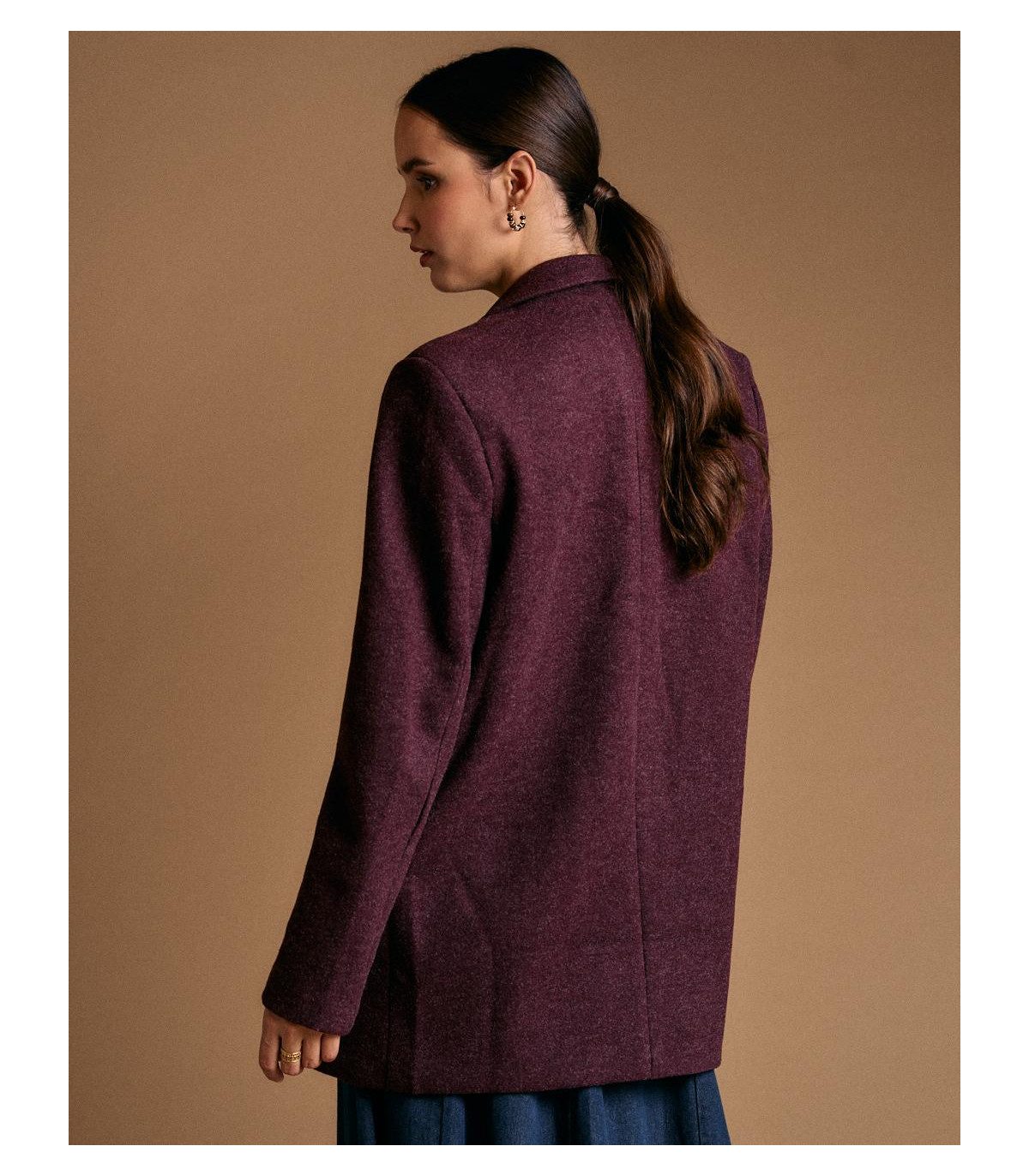 Abrigo de paño en color berenjena. Diseño clásico con solapas, cierre de botones delanteros y bolsillos con solapa. Manga larga y corte estructurado.