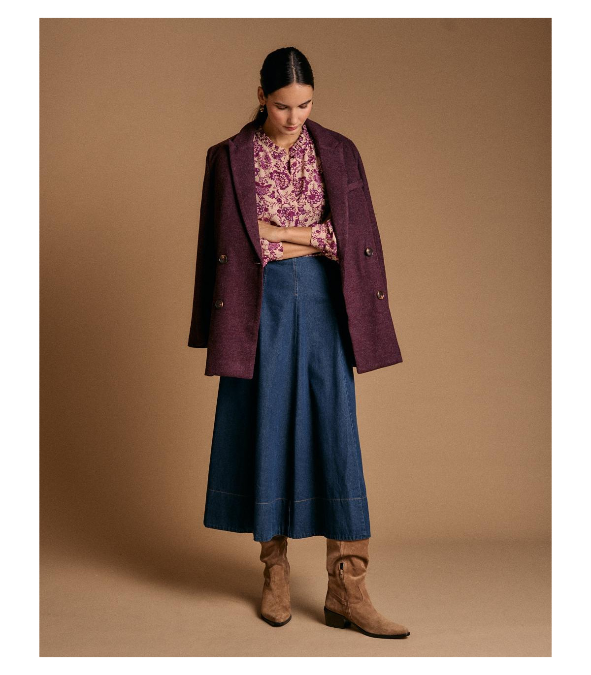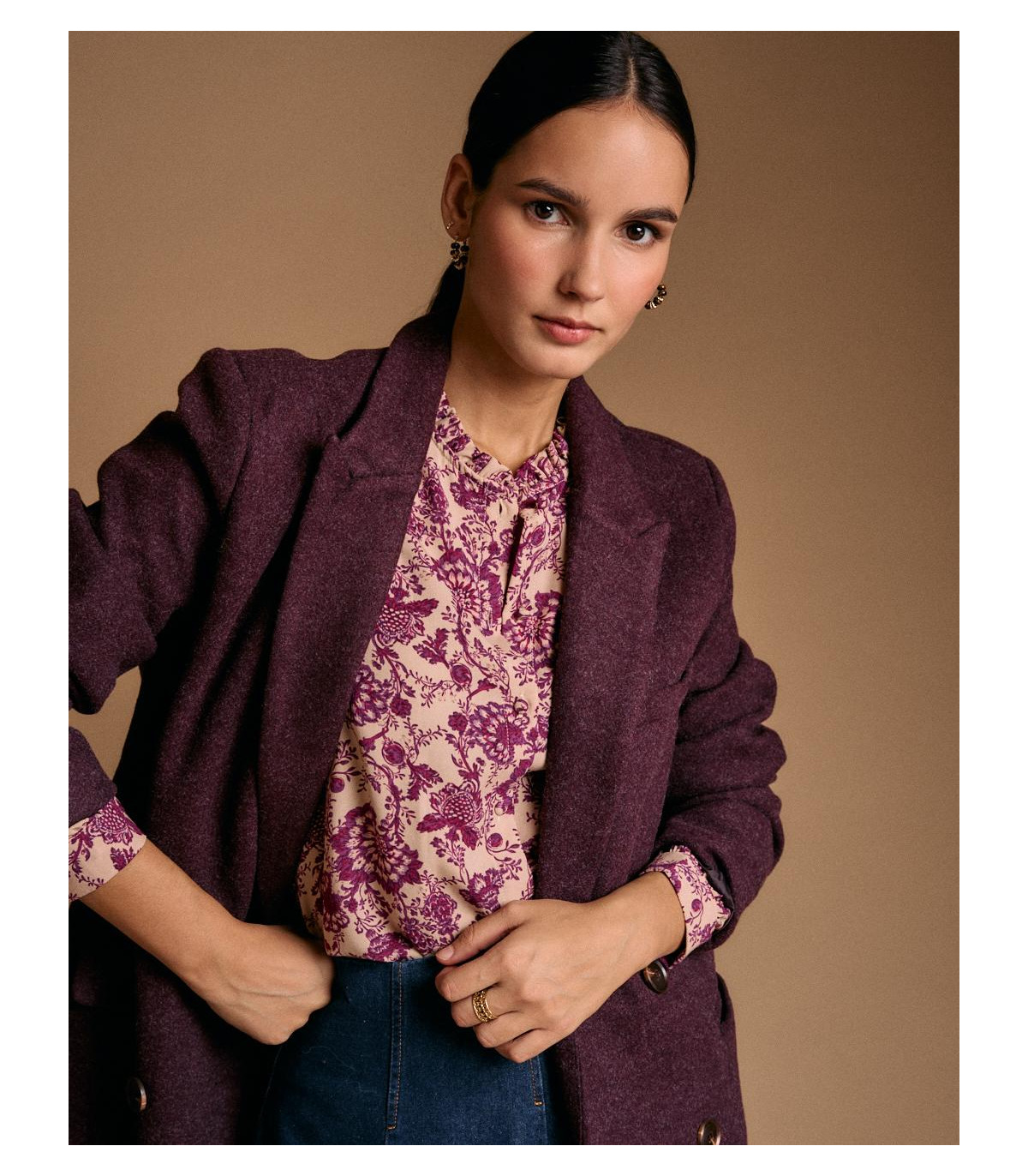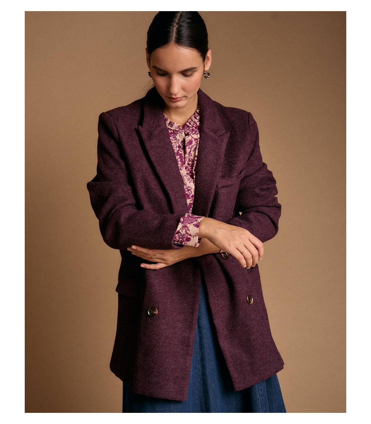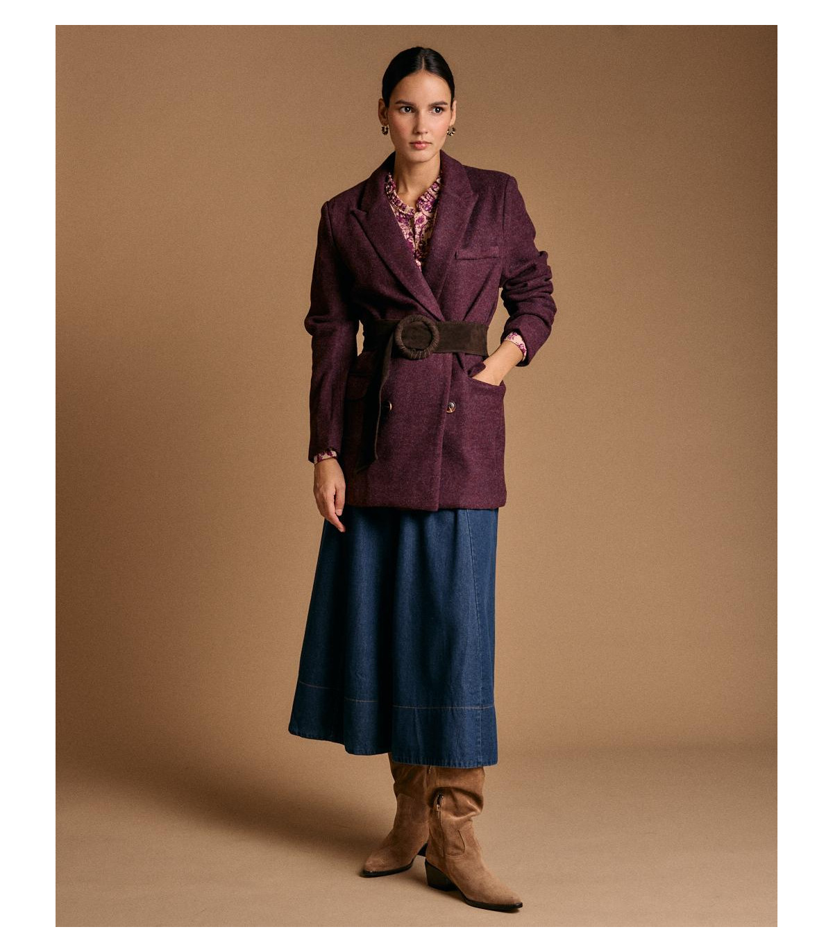 Abrigo de paño en color berenjena. Diseño clásico con solapas, cierre de botones delanteros y bolsillos con solapa. Manga larga y corte estructurado.