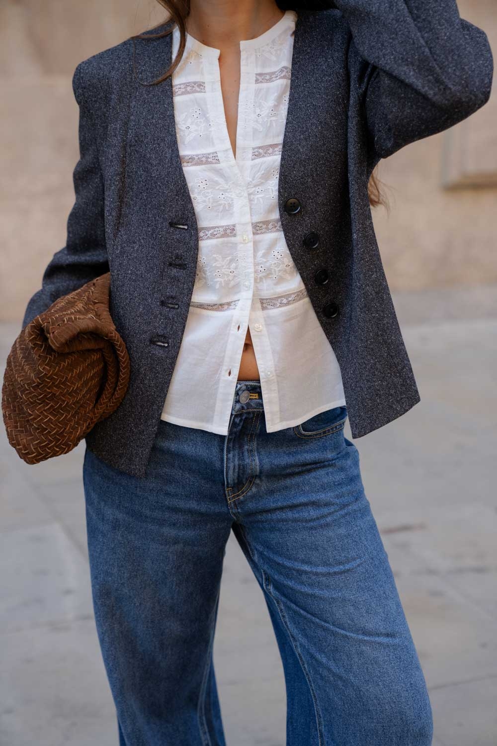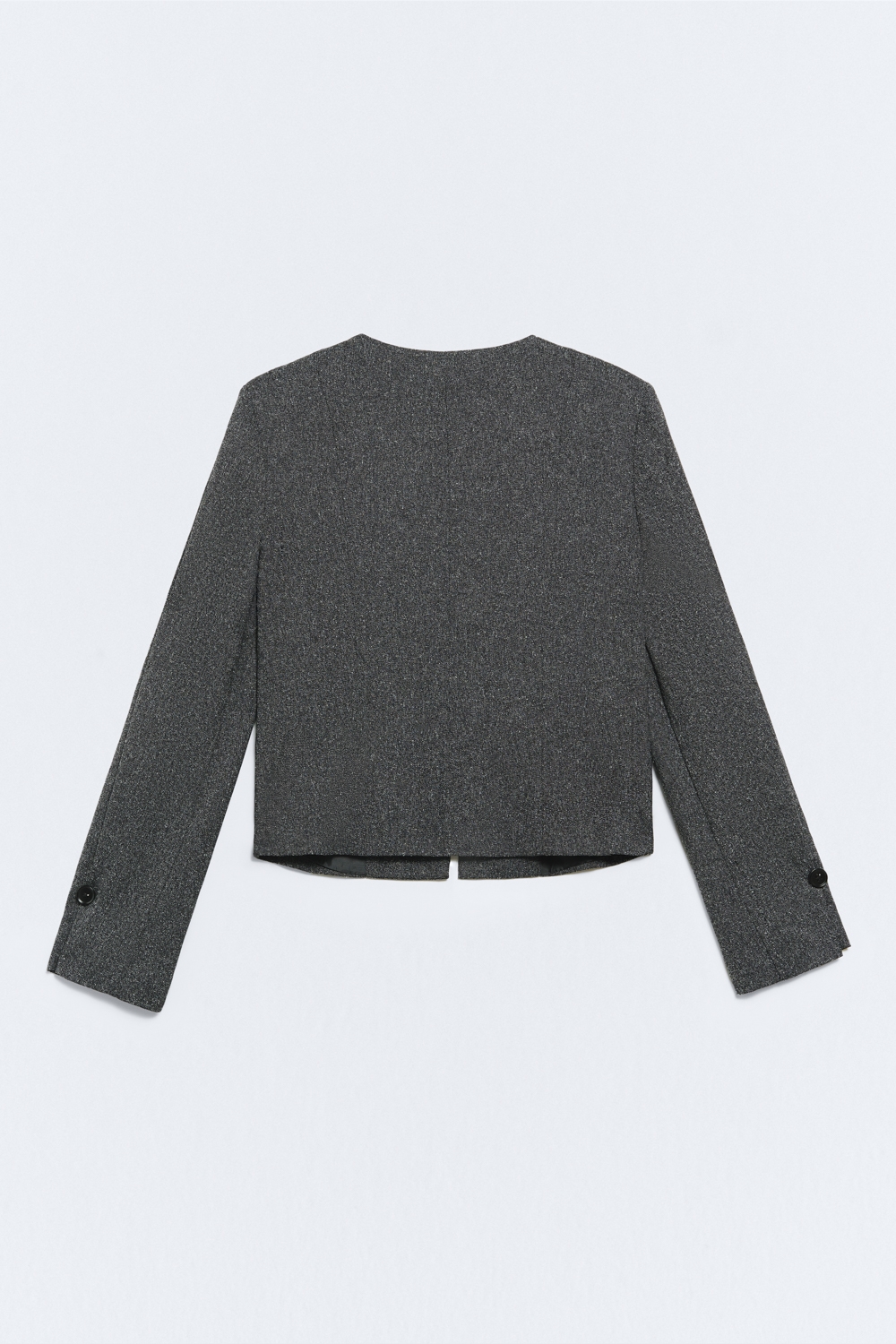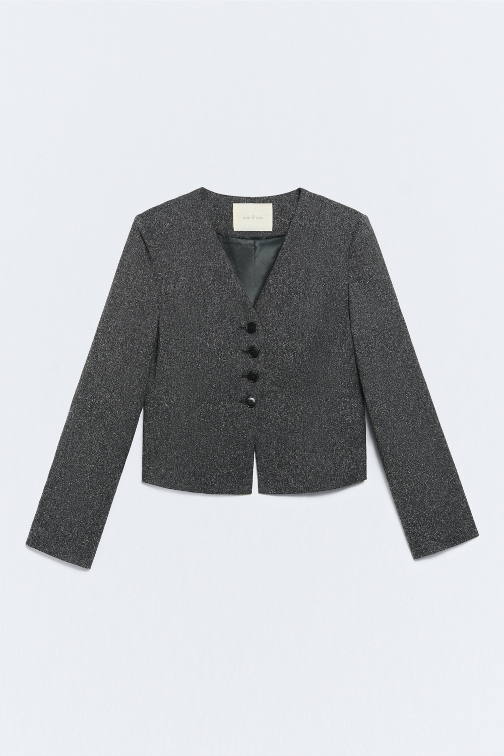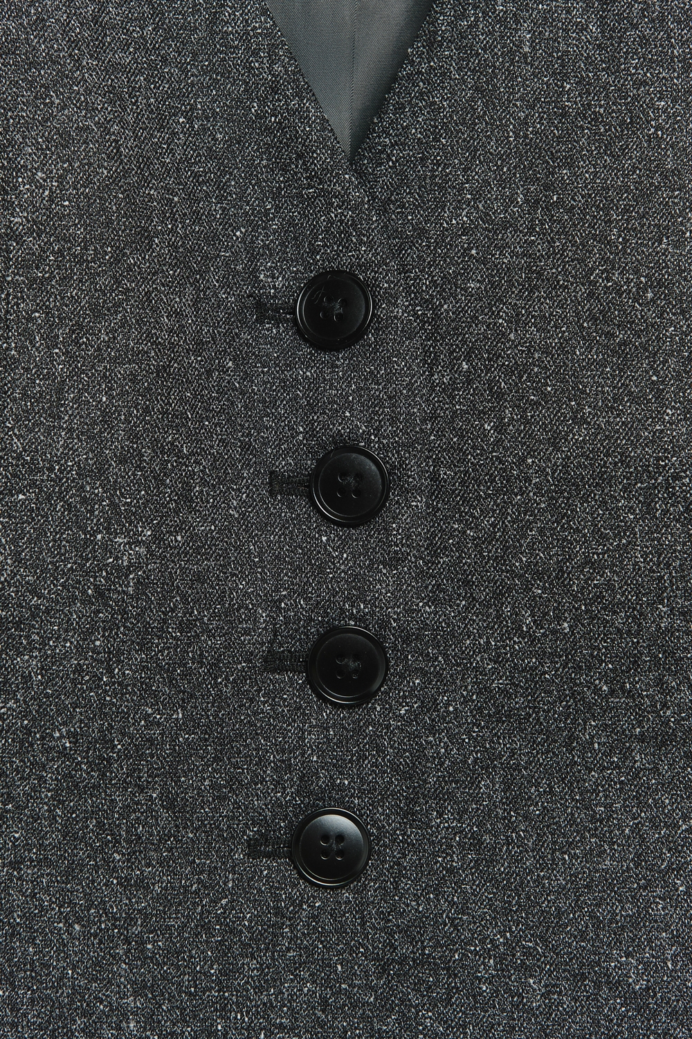 Blazer entallada con costadillos. Tejido jaspeadio tipo cheviot compuesto de fibras recicladas. Botonadura simple. Cuello pico. Interior forrado en satén de poliéster. Chaleco y pantalón a conjunto. Largo prenda para talla S: 55,5 cm.