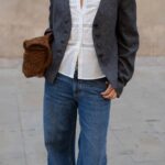 Blazer entallada con costadillos. Tejido jaspeadio tipo cheviot compuesto de fibras recicladas. Botonadura simple. Cuello pico. Interior forrado en satén de poliéster. Chaleco y pantalón a conjunto. Largo prenda para talla S: 55,5 cm.