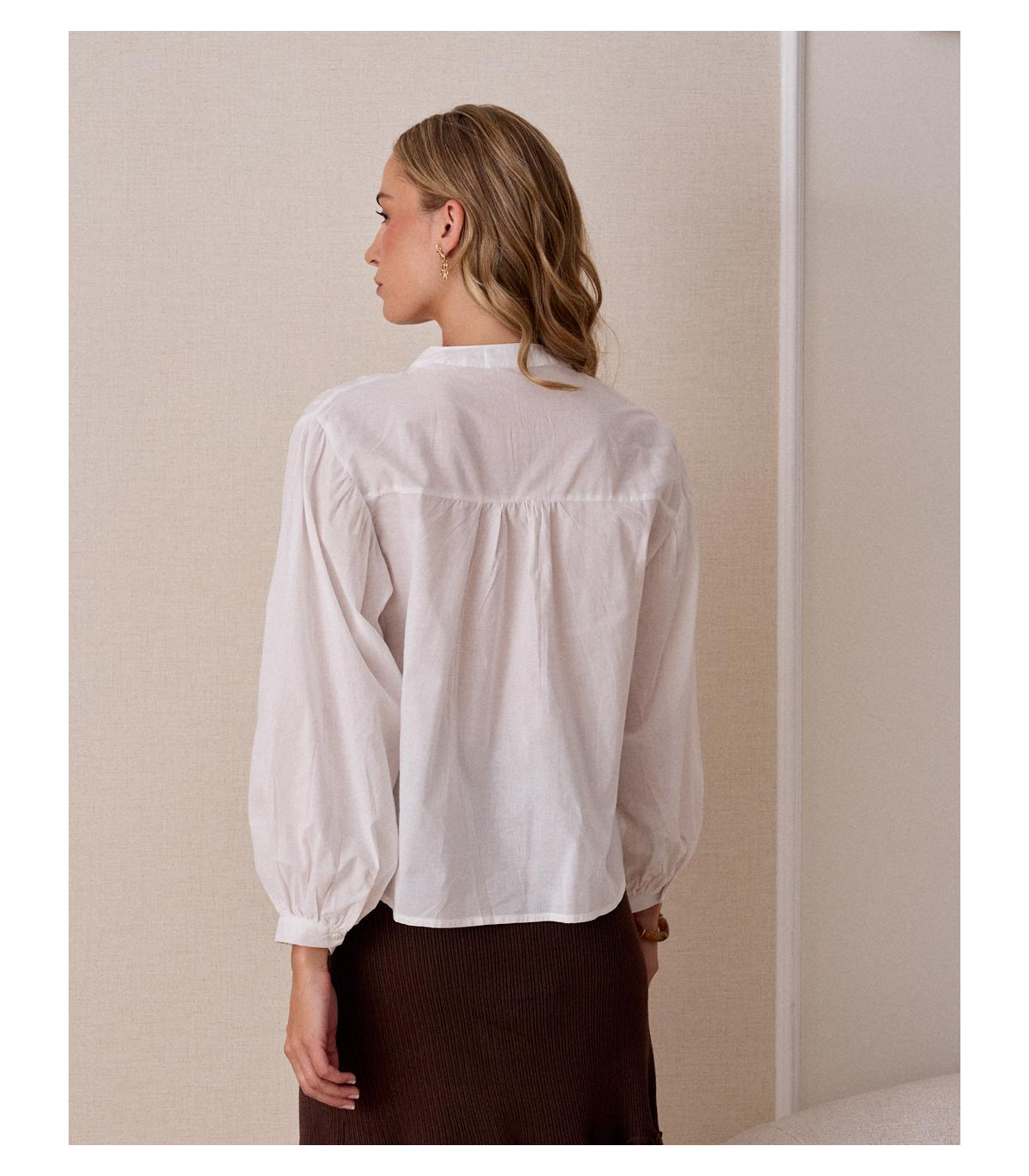 Camisa en color blanco con detalle de bordado en la parte superior delantera. Cuello redondo con abertura frontal y cierre mediante botones.