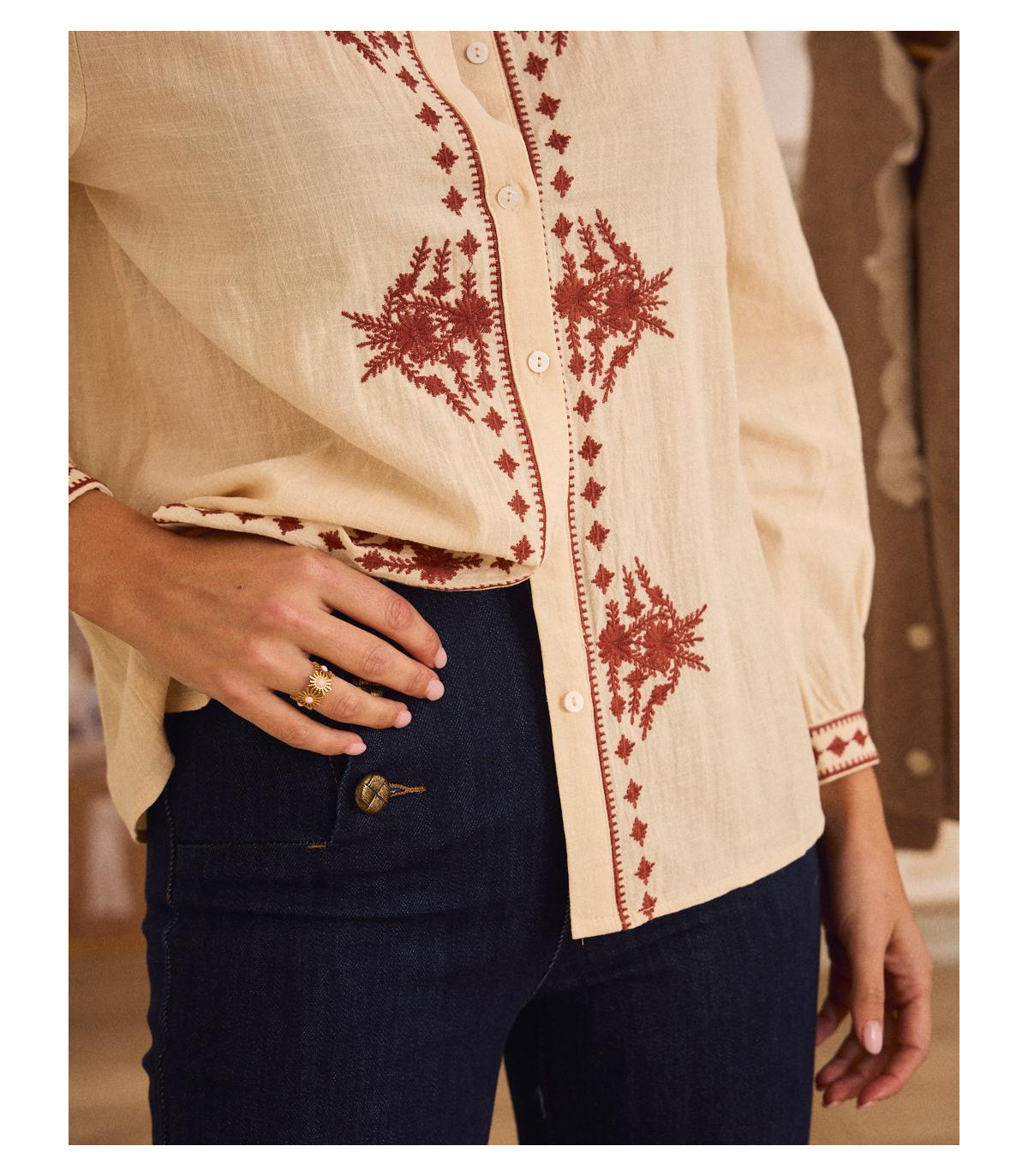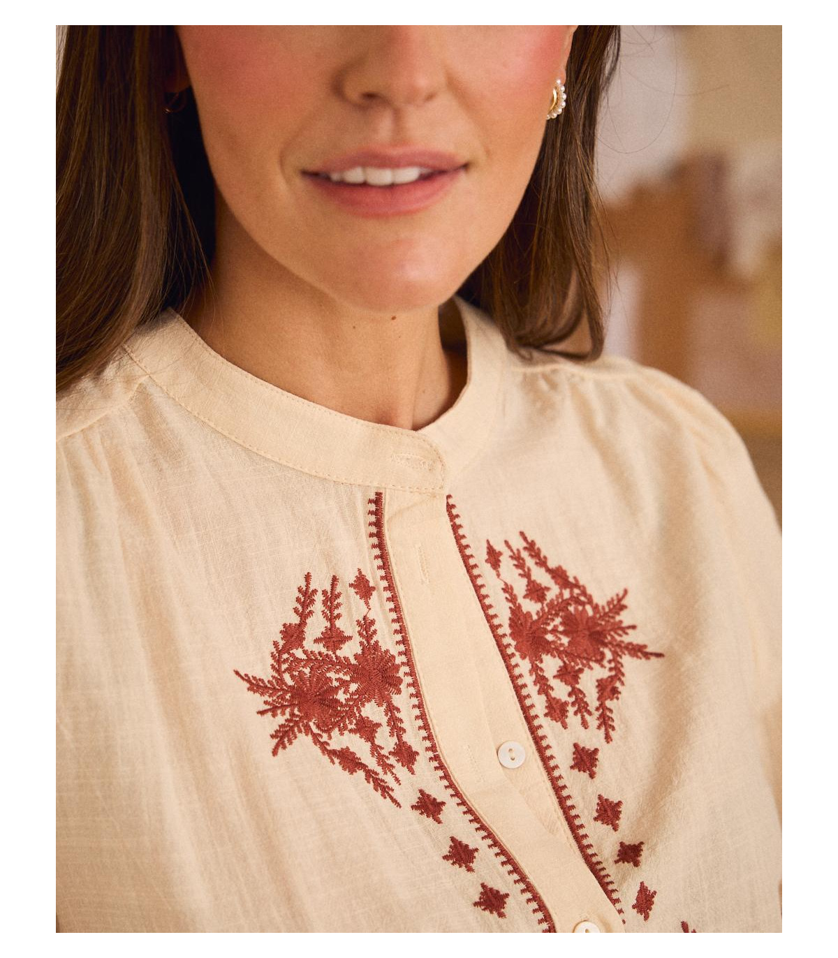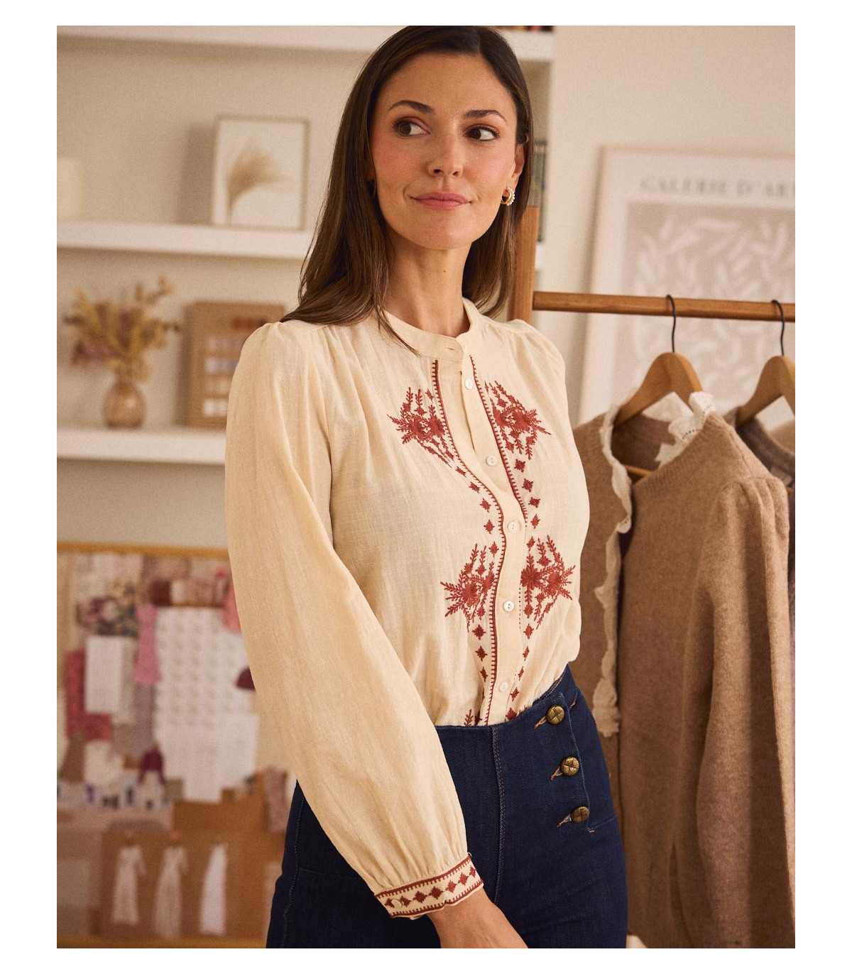 Camisa de color crudo con bordados en un tono caldero y detalles decorativos. Es una camisa de cuello Mao, abotonada, con mangas abullonadas con detalles bordados en los puños. Los bordados de flores aportan un aire romántico y femenino.