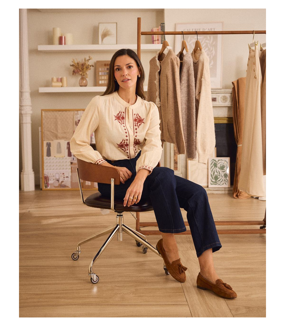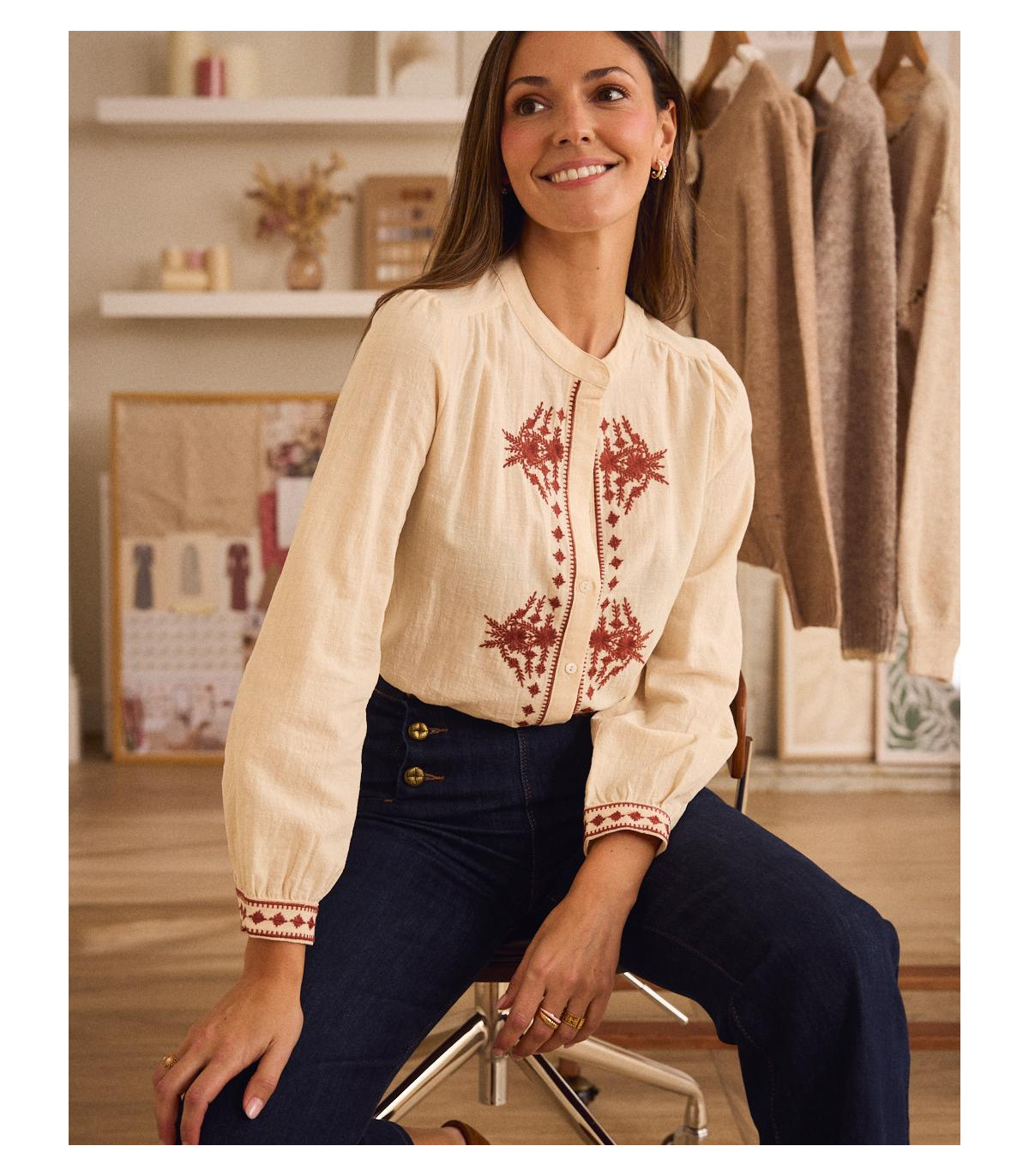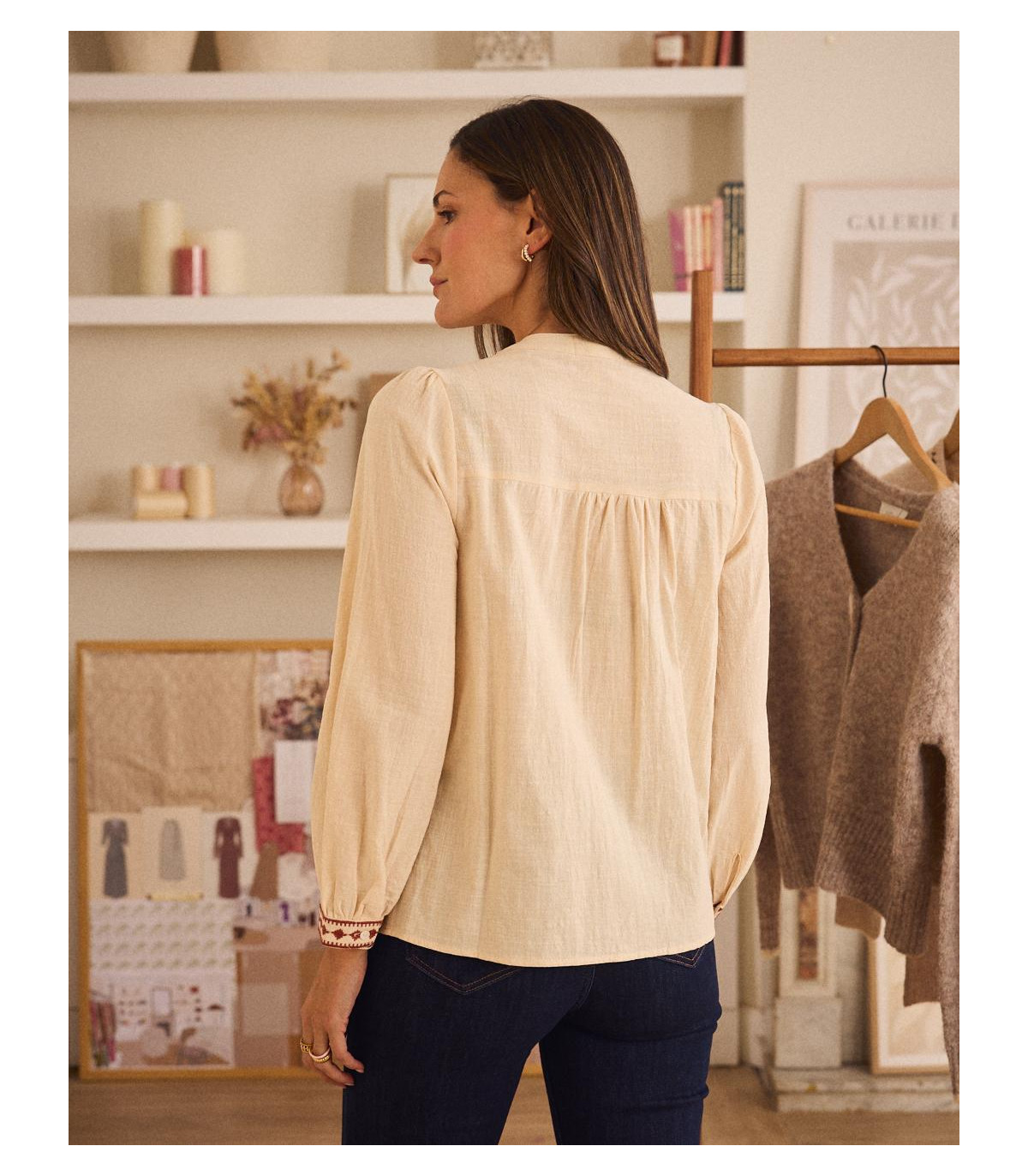 Camisa de color crudo con bordados en un tono caldero y detalles decorativos. Es una camisa de cuello Mao, abotonada, con mangas abullonadas con detalles bordados en los puños. Los bordados de flores aportan un aire romántico y femenino.