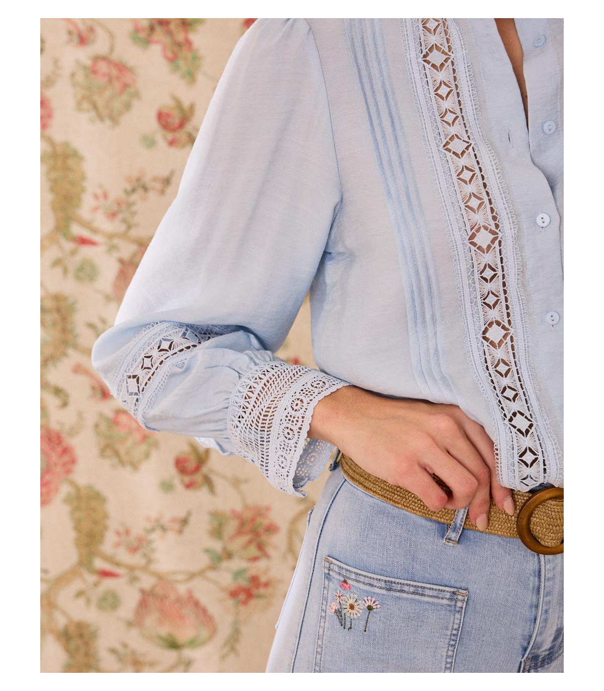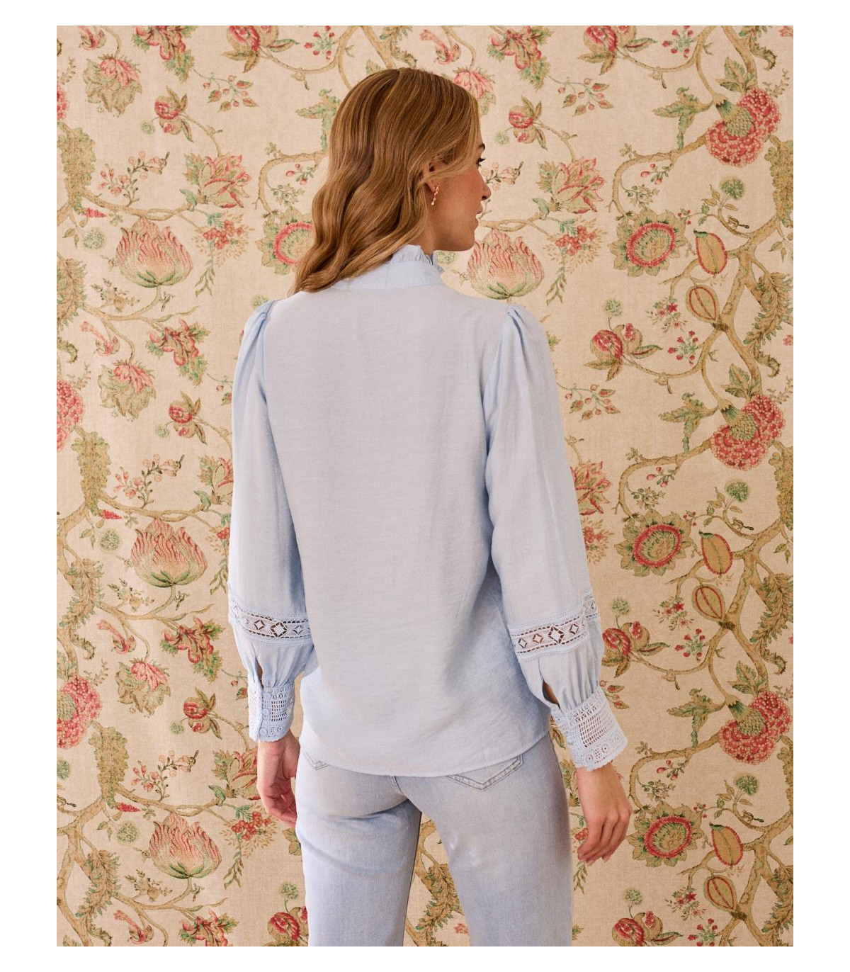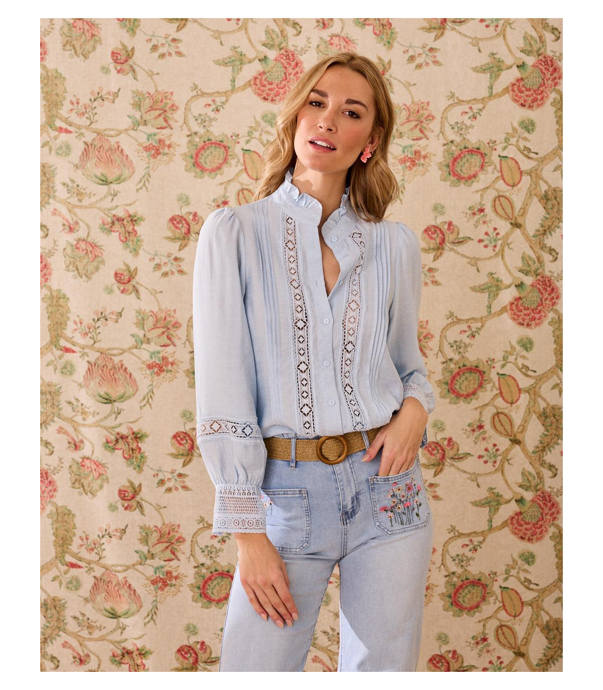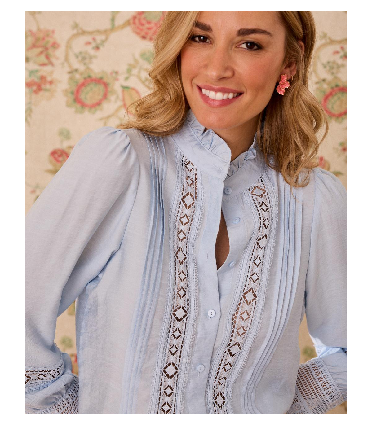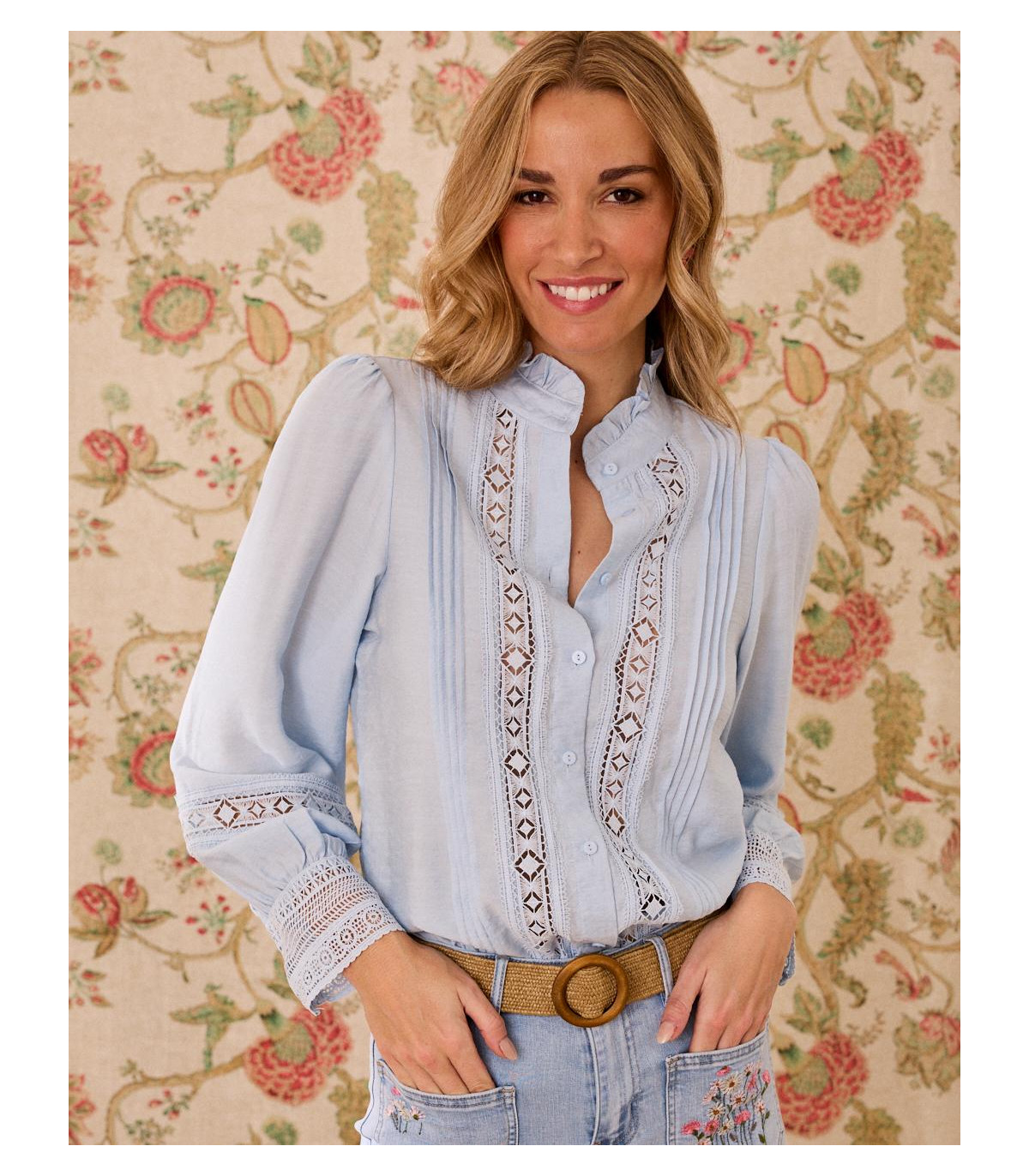 Camisa en tono azul, con un diseño bordado, una prenda perfecta para looks femeninos y atemporales. Destaca por su cuello estilo ruffle, que aporta un aire romántico y delicado, ideal para elevar cualquier outfit. Confeccionada en un tejido ligero y cómodo, cuenta con manga larga con puño fruncido y cierre frontal con botones. Una prenda versátil que puedes combinar tanto con jeans como con faldas para un estilo casual chic o más arreglado.