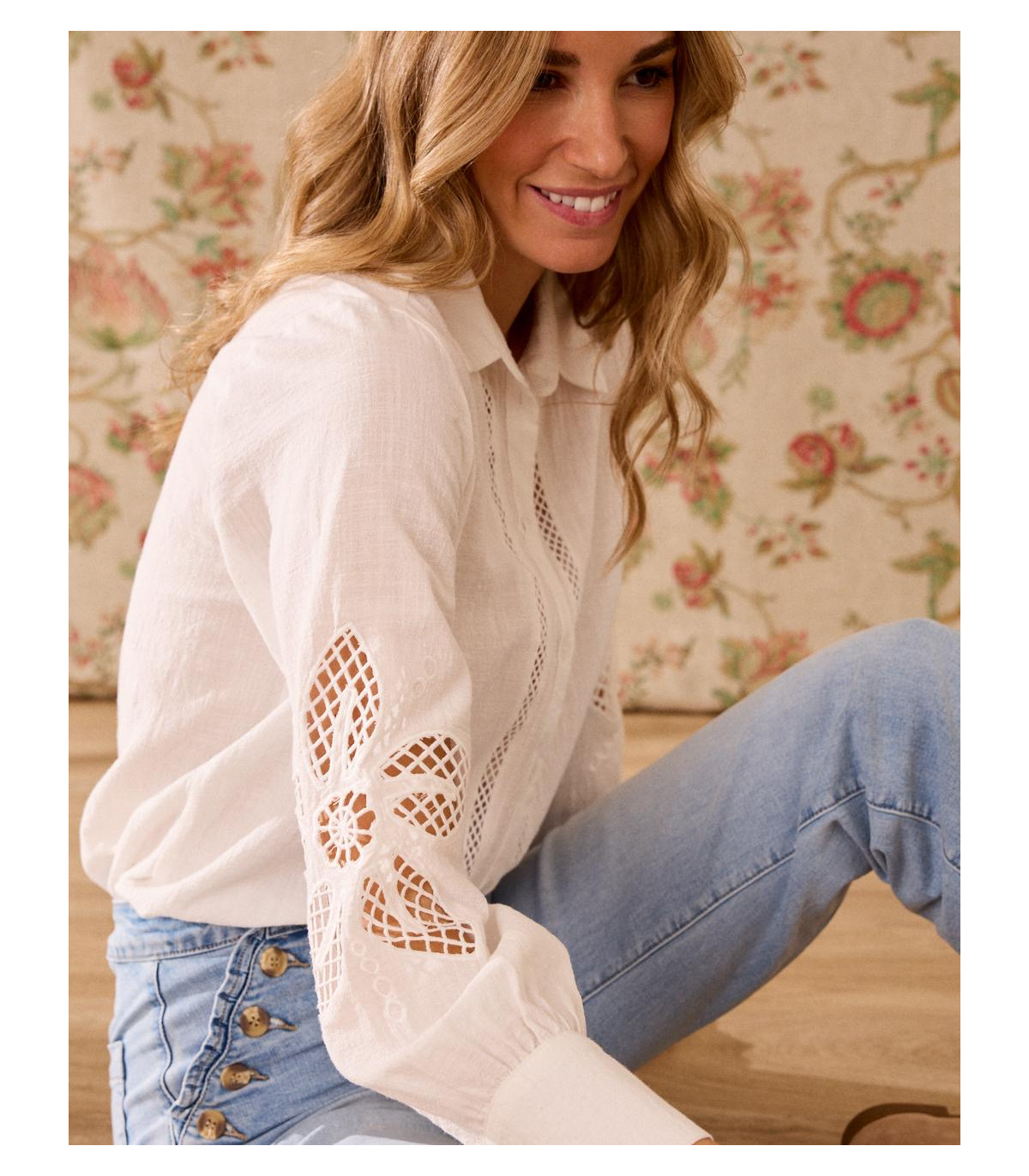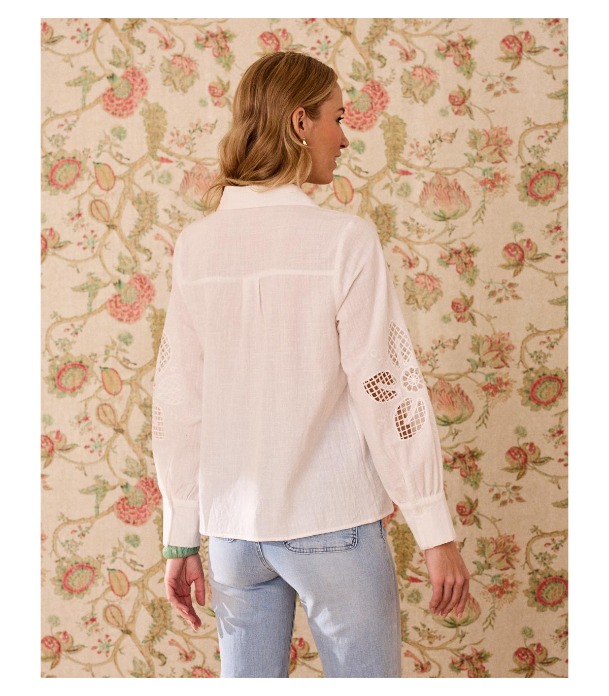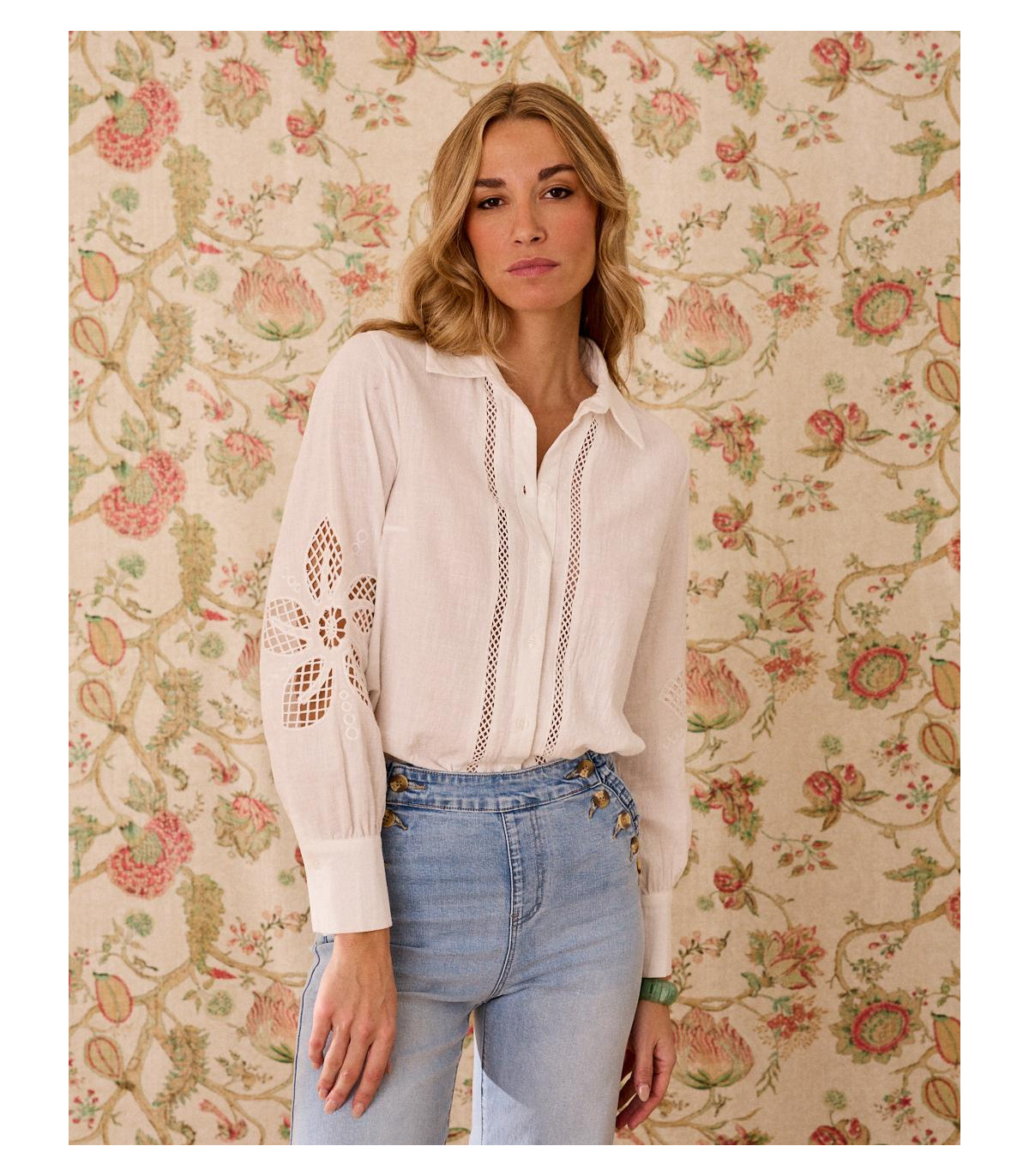 Camisa de color blanco con bordados calados. Camisa confeccionada con un tejido suave y fluido, de corte clásico, abotonada de arriba abajo, de manga larga. Es una prenda única por sus bordados que aportan un toque sofisticado, romántico e ideal para esta temporada.