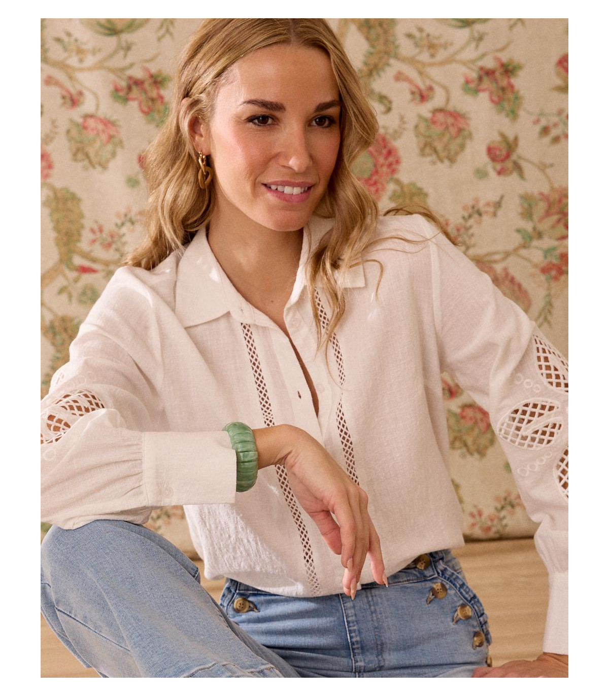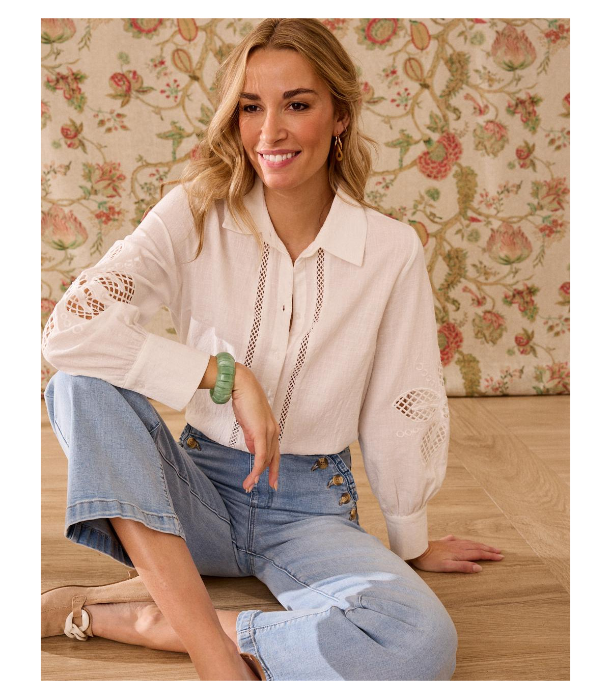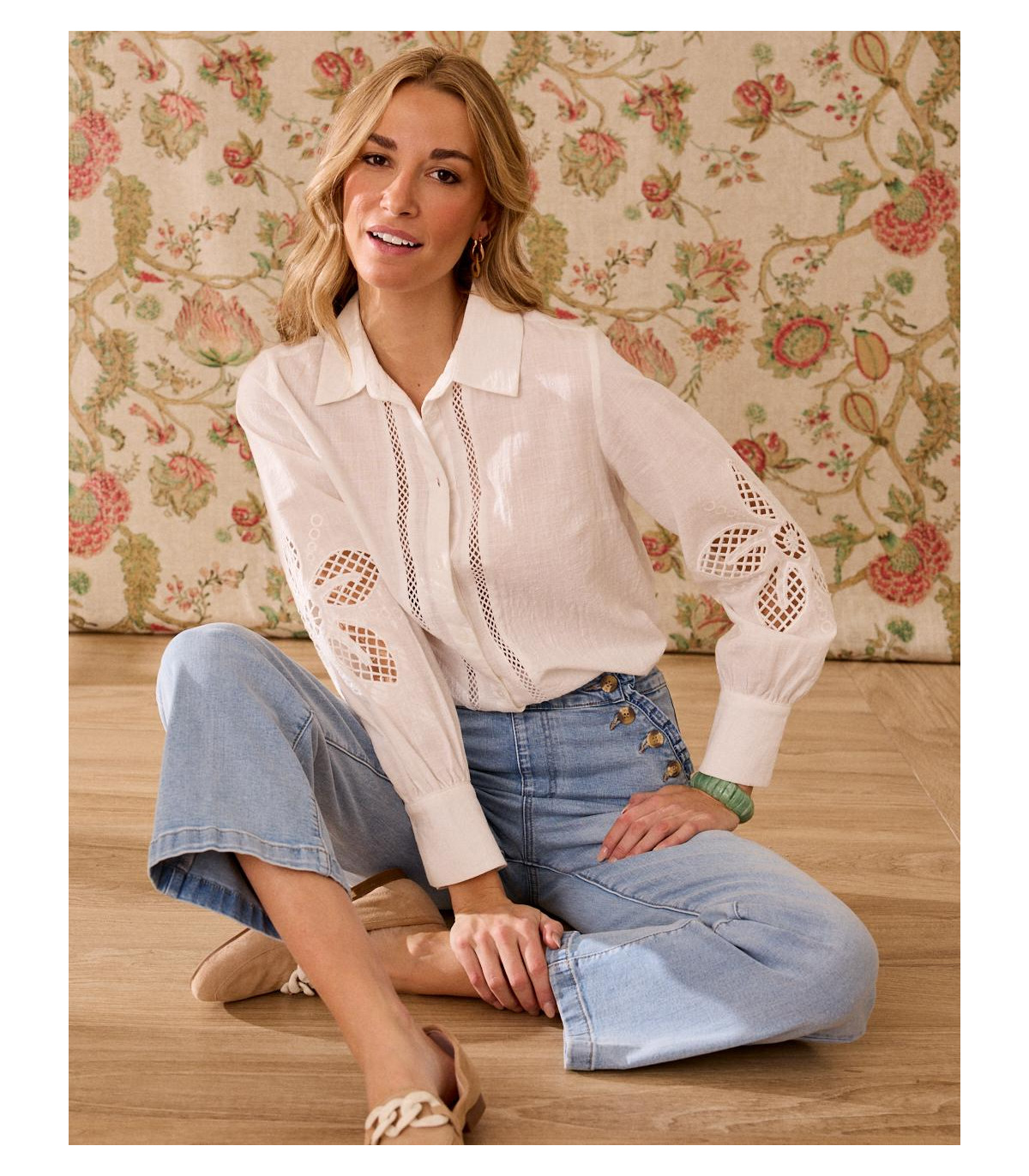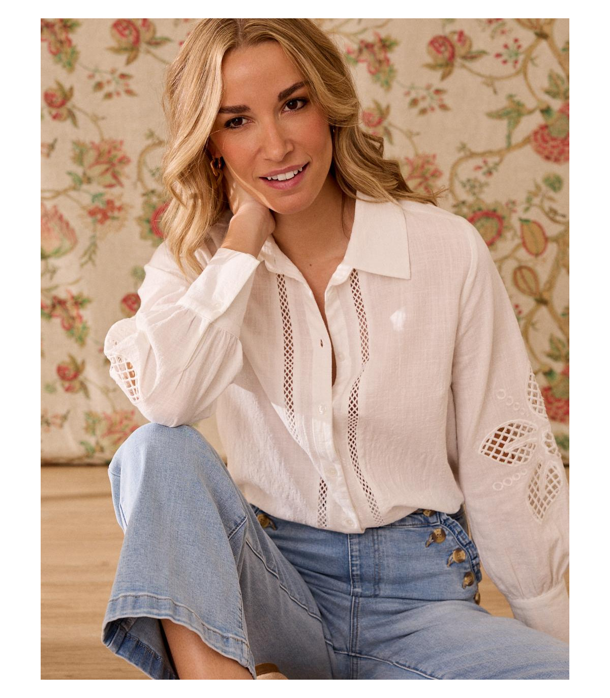 Camisa de color blanco con bordados calados. Camisa confeccionada con un tejido suave y fluido, de corte clásico, abotonada de arriba abajo, de manga larga. Es una prenda única por sus bordados que aportan un toque sofisticado, romántico e ideal para esta temporada.