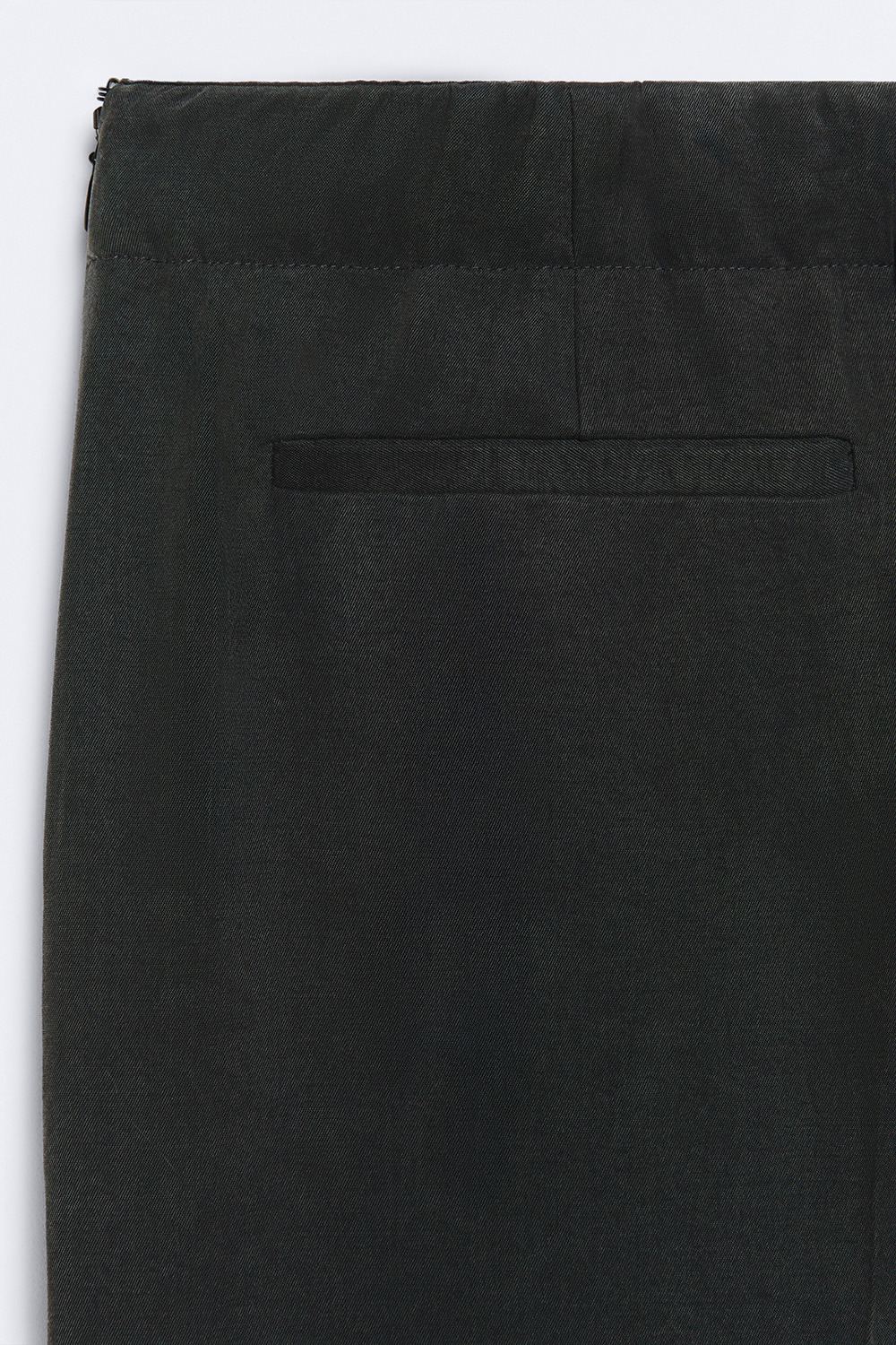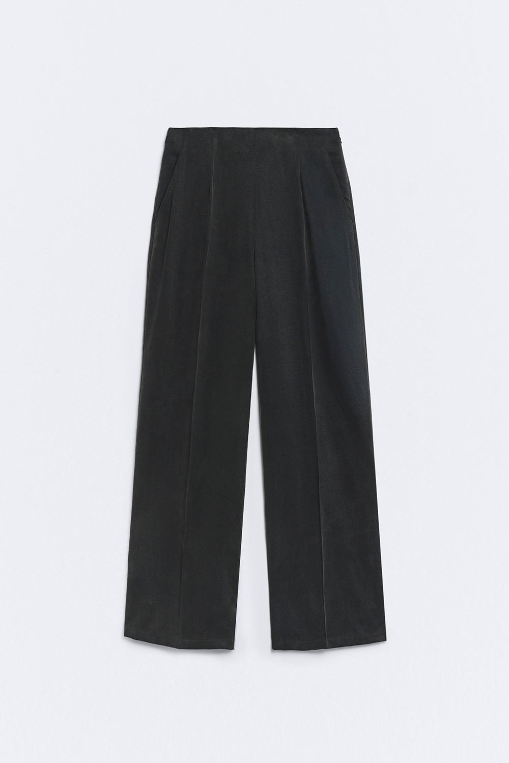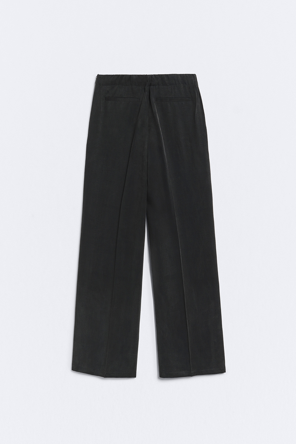 Pantalón fluido con brillo mate. Tejido de apariencia y textura cupro. Hecho de mezcla tencel-viscosa. Cinturilla fina. Cremallera invisible. Fitting palazzo. Largo prenda para talla S: 104 cm.