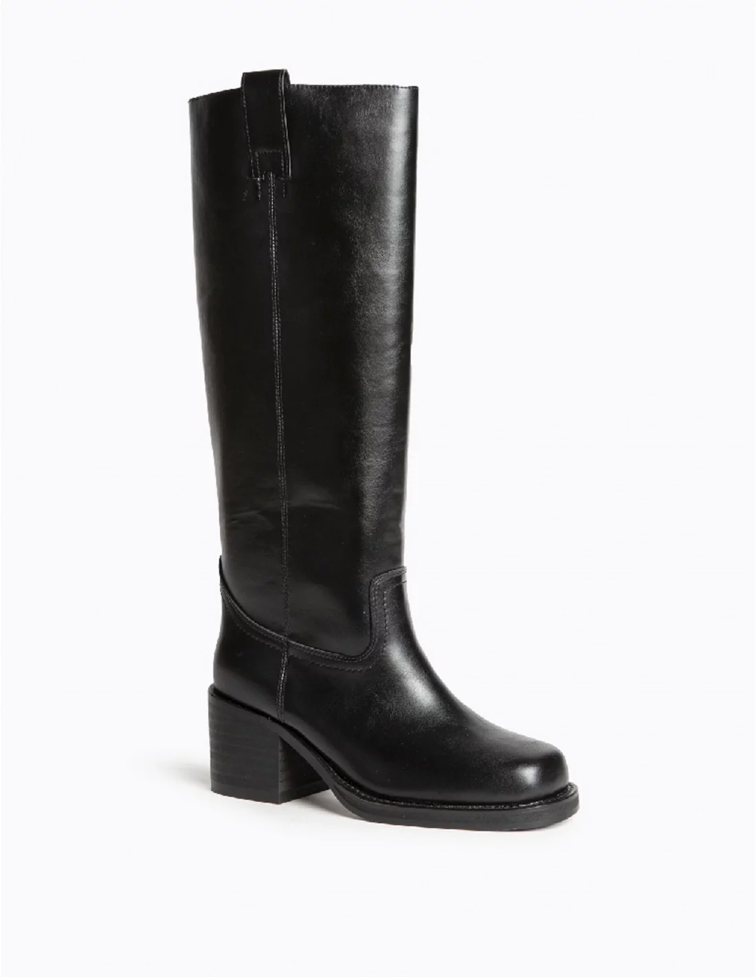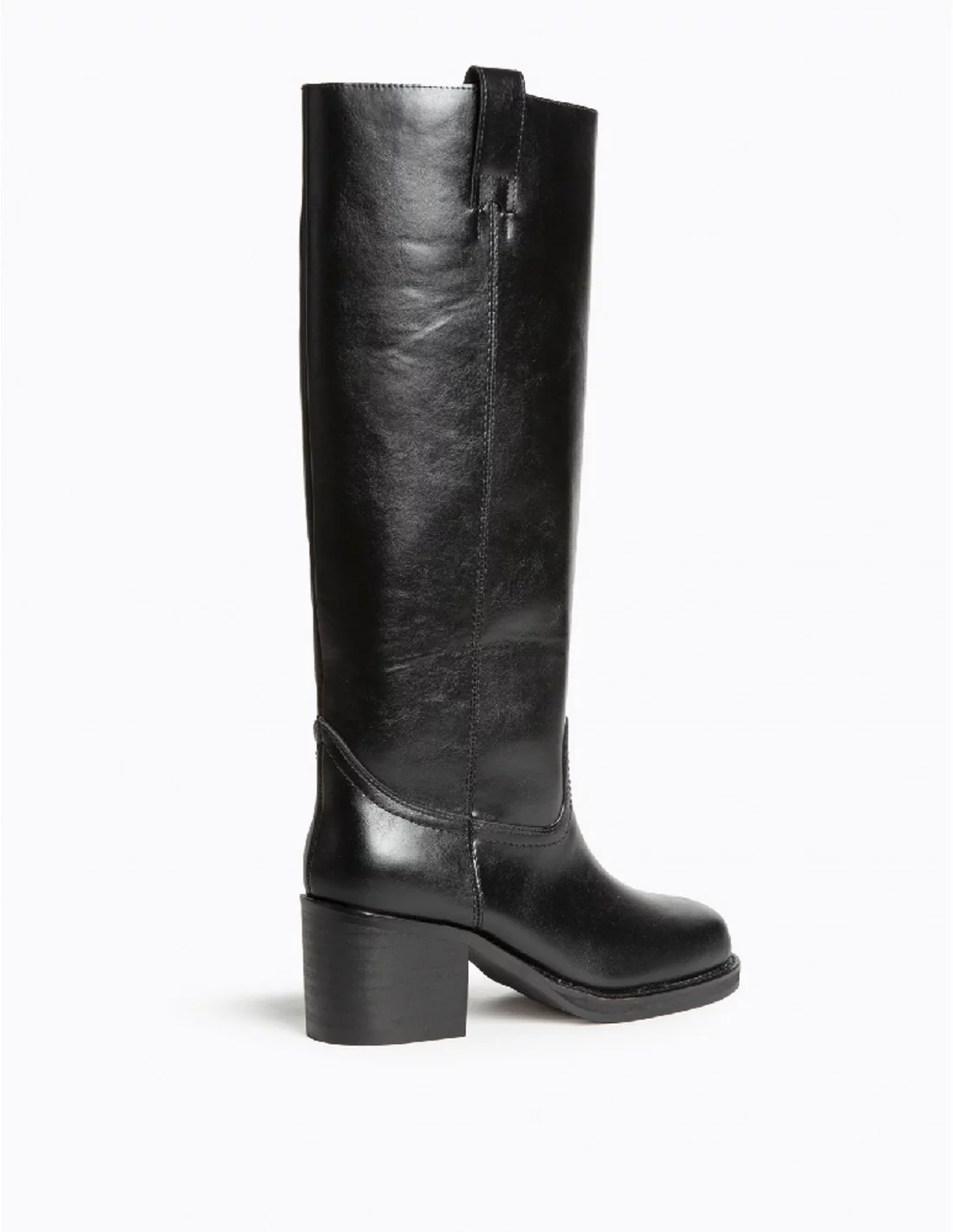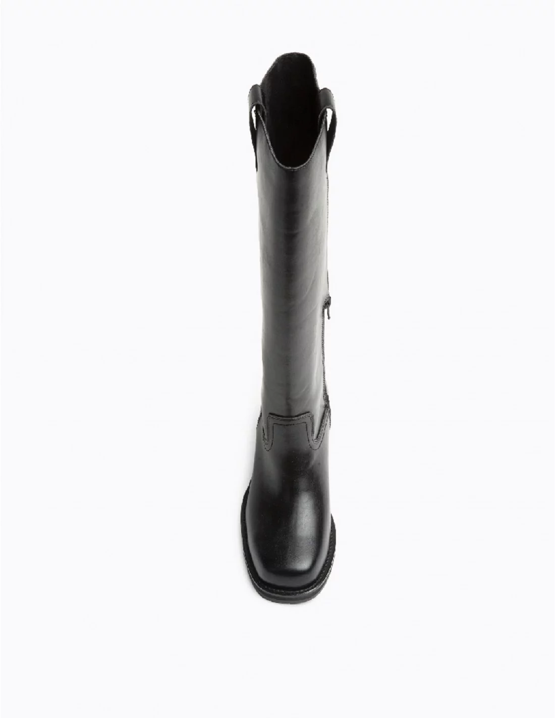 Bota biker de caña alta con punta cuadrada. Suela gruesa y tacón robusto de tendencia. Tiene una cremallera lateral para que te las pongas sin esfuerzo. Este modelo de caña alta es la combinación perfecta entre un diseño clásico y un espíritu rebelde.