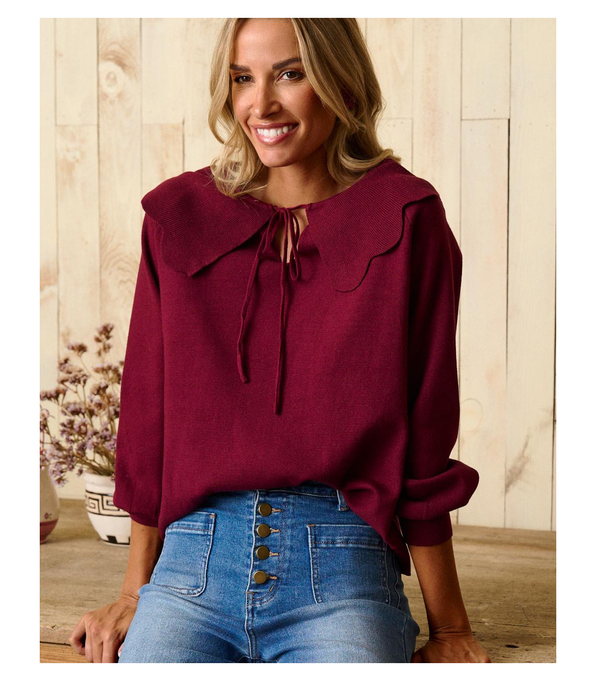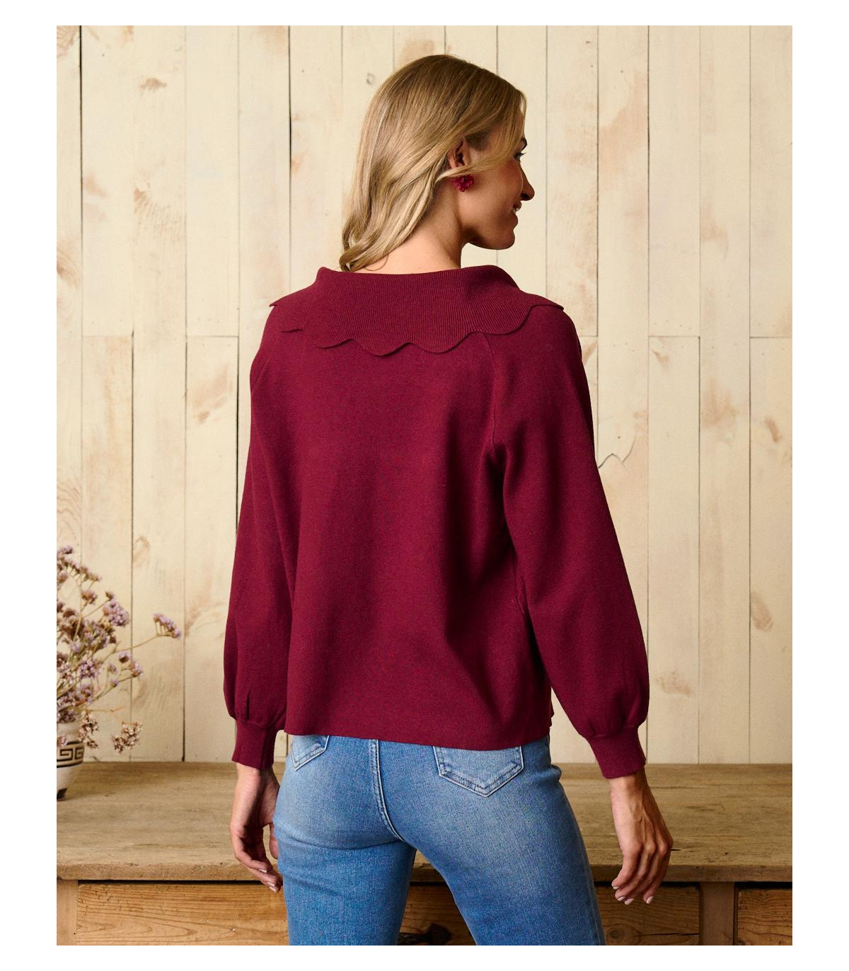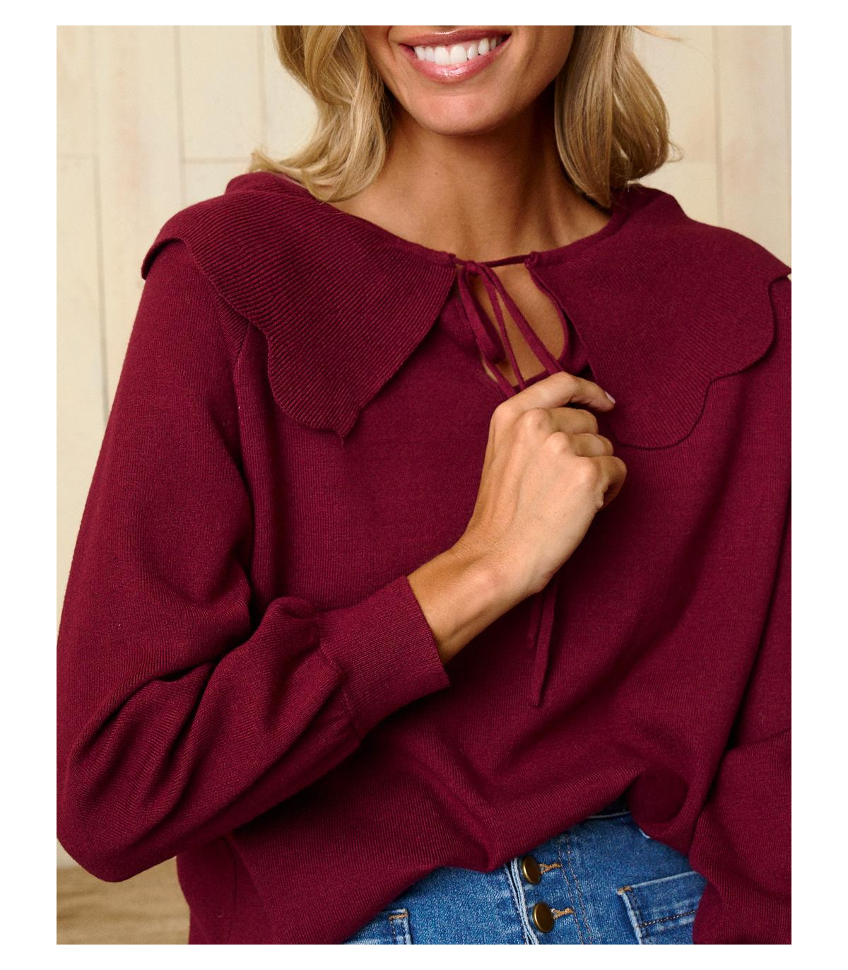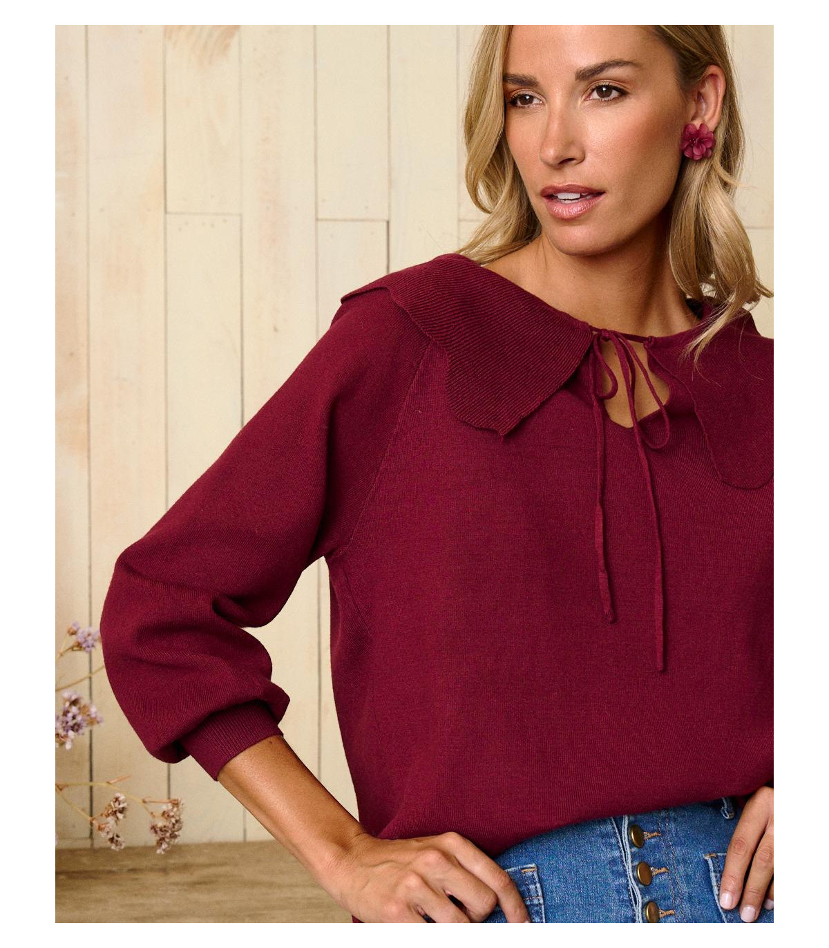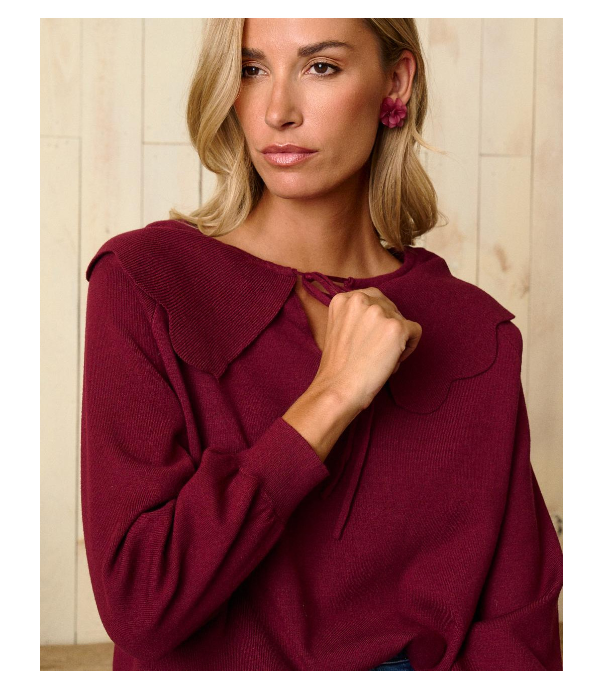 Jersey en color burdeos, con un cuello amplio de estilo babero y escote de pico que se ajusta con cordones. Las mangas son largas y abullonadas, y su corte holgado le da un toque de estilo y comodidad.